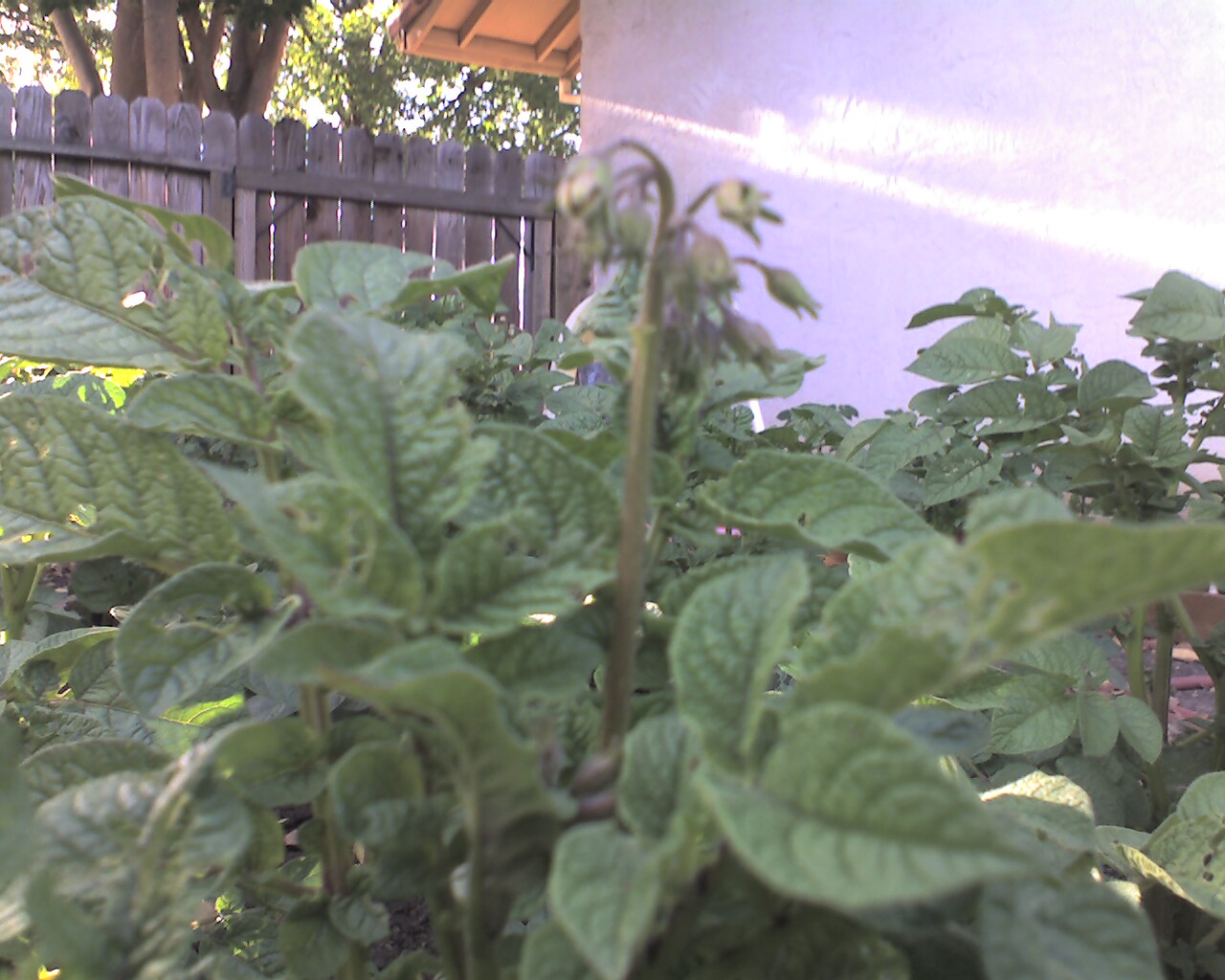 And then we come to the potato beds…where there are flowers. Now people, I am ashamed to confess that I never really thought about potatoes and how they look when they grow. If you had asked me to guess, I would have expected some low, ugly bush with a bunch of knobby roots growing under it. Something stunted, with all that energy going into those big bulbous roots below.